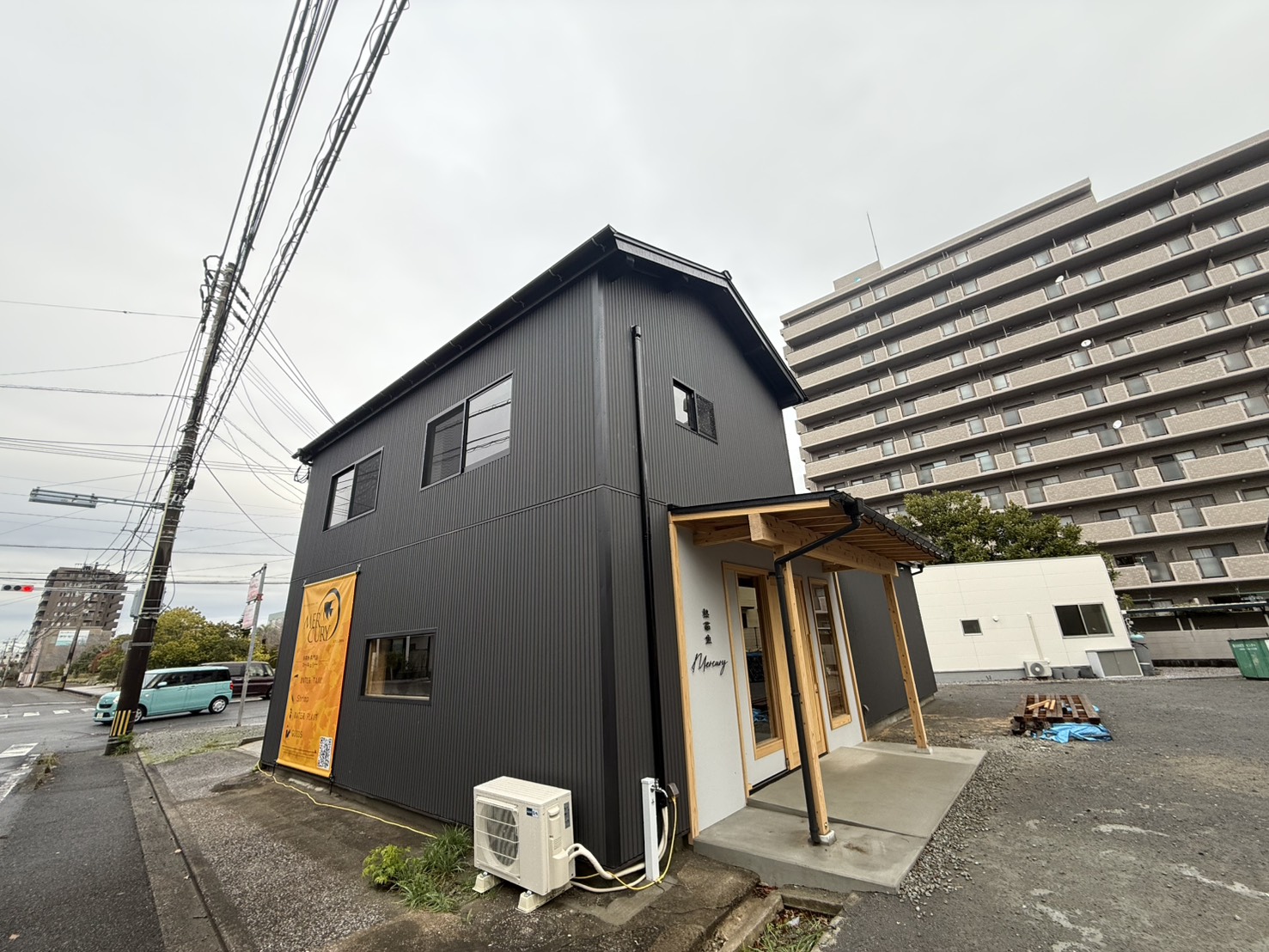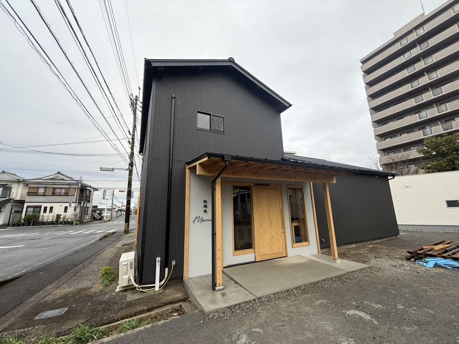 外装:外壁はダークカラーのガルバリウム鋼板と白い塗り壁を組み合わせ、木製の柱や軒をアクセントに取り入れたナチュラルモダンな仕上がりになりました。正面には「熱帯魚 Mercury」のロゴサインも設置され、印象的な店構えが完成しています。