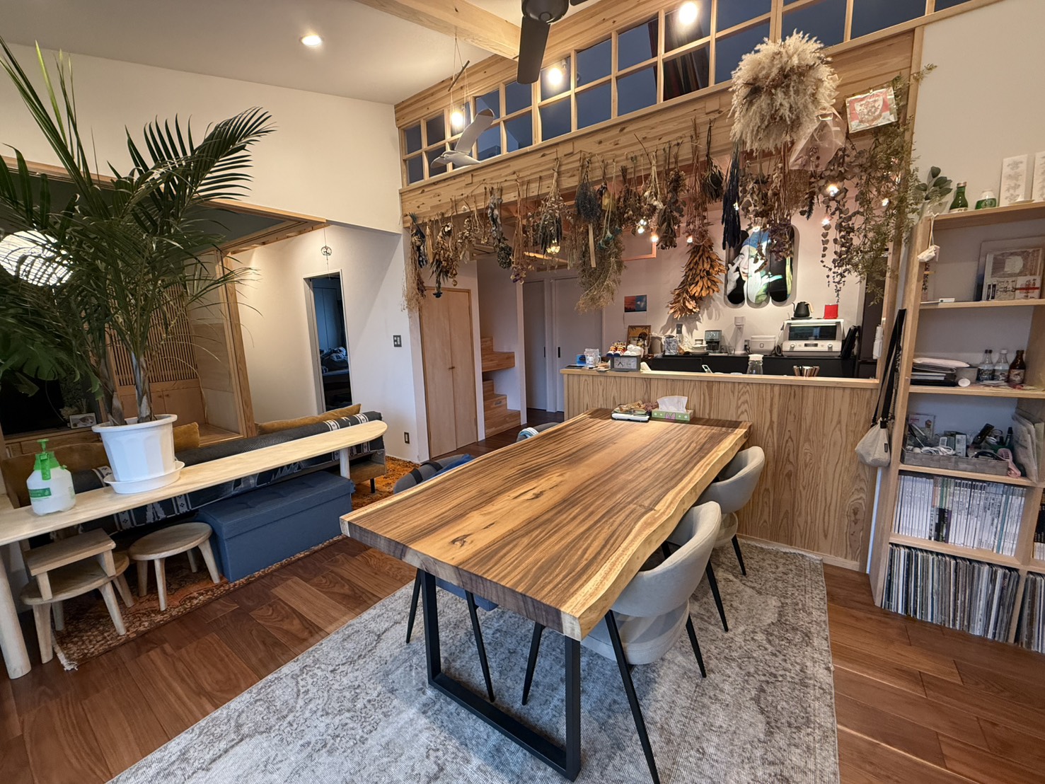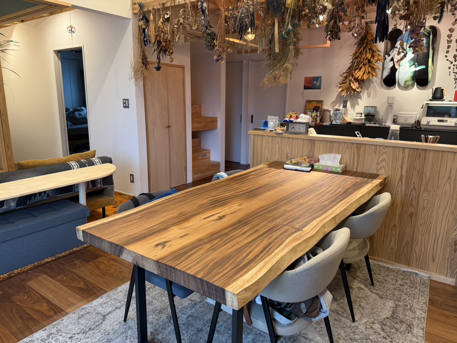 施工のこだわり:一枚板の個性を最大限に引き出すため、木の状態に合わせた塗装仕上げを丁寧に行っています。脚の取り付け位置や高さも使いやすさを考慮して調整し、長く愛用いただけるテーブルに仕上げました。